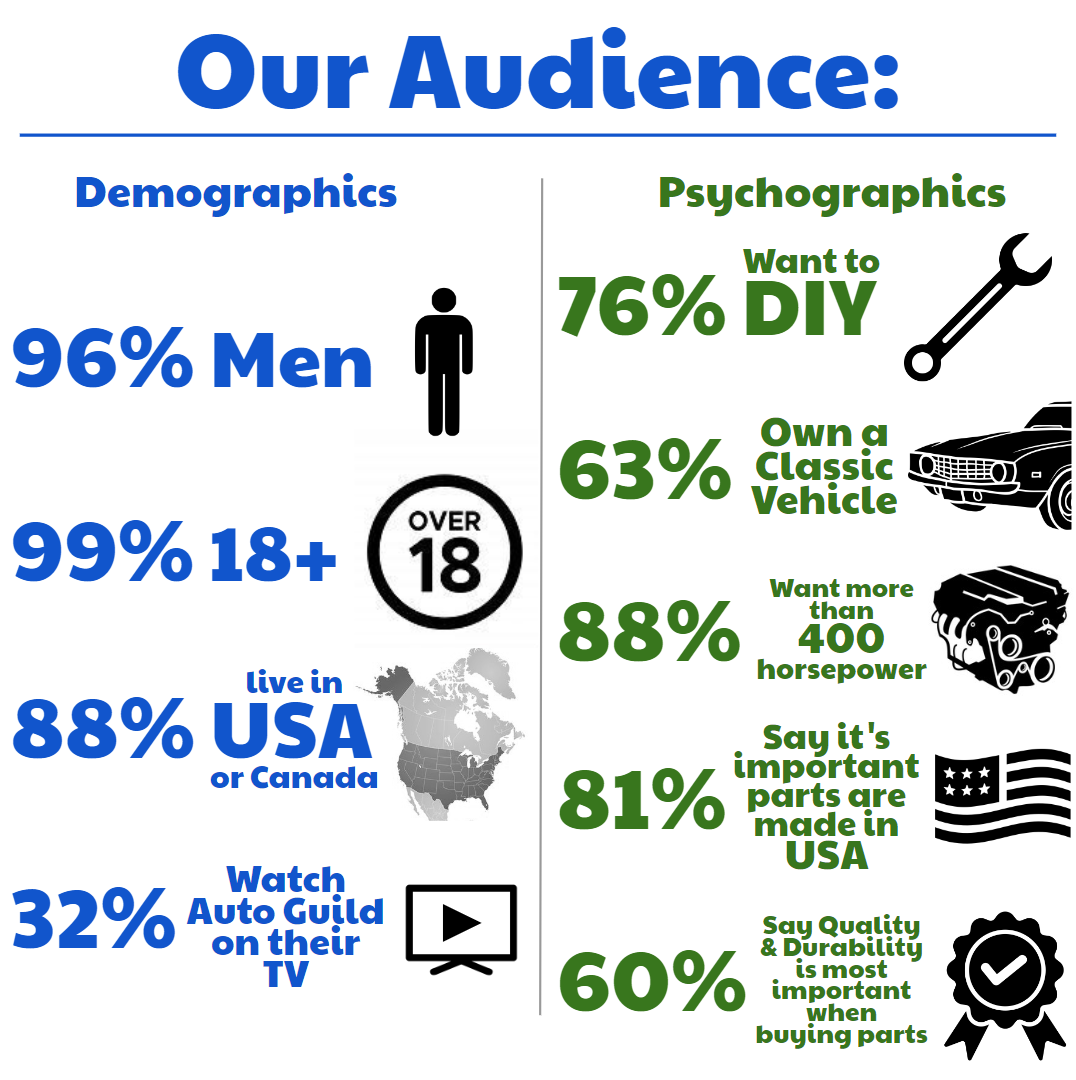 Auto Guild is focused on helping viewers build great cars through expertly researched information and advice. Viewers come to Auto Guild more for information than entertainment, and most are in the planning and building phase. This means they are ready to buy and count on Auto Guild to help them make smart purchases.